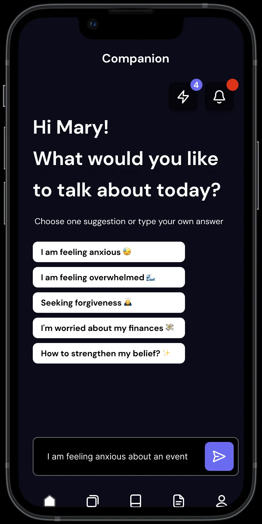 Powered by cutting-edge technology, Companion allows you to explore your faith privately, guiding you towards deeper spiritual clarity and inner peace. Companion uses large language model to generate personalised devotions , reflections, songs and wellbeing practices